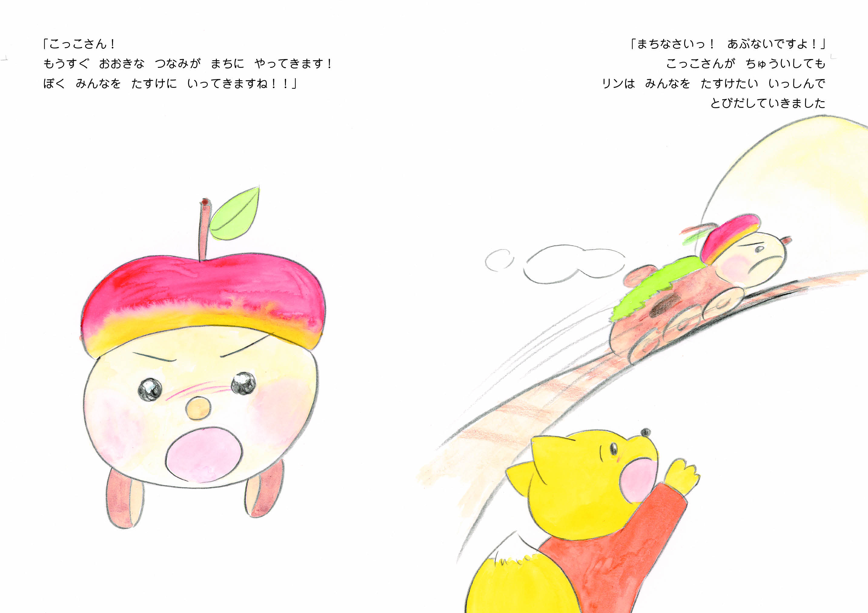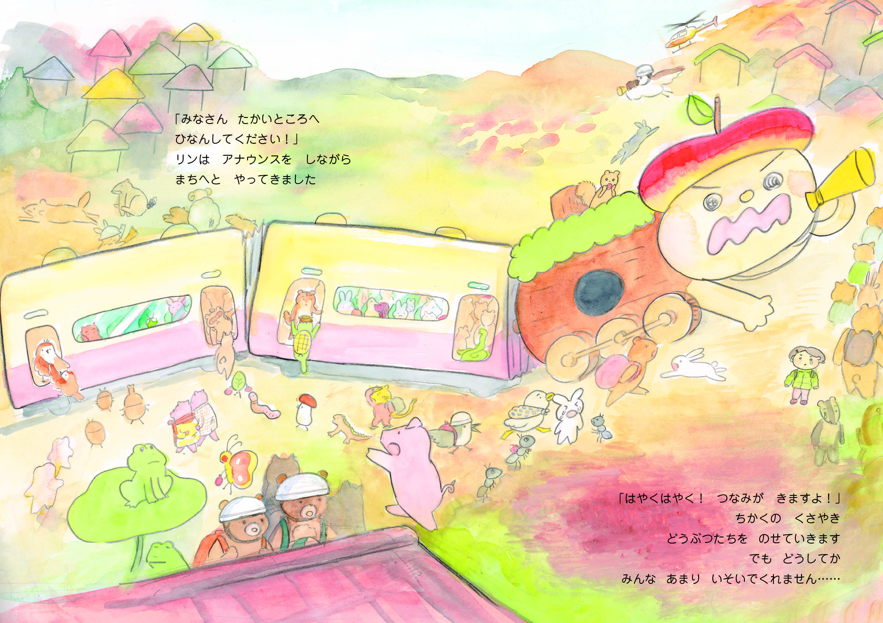 もりのきでんしゃが、地震と津波が起きた海沿いの町に、生き物たちを救いに行きます。