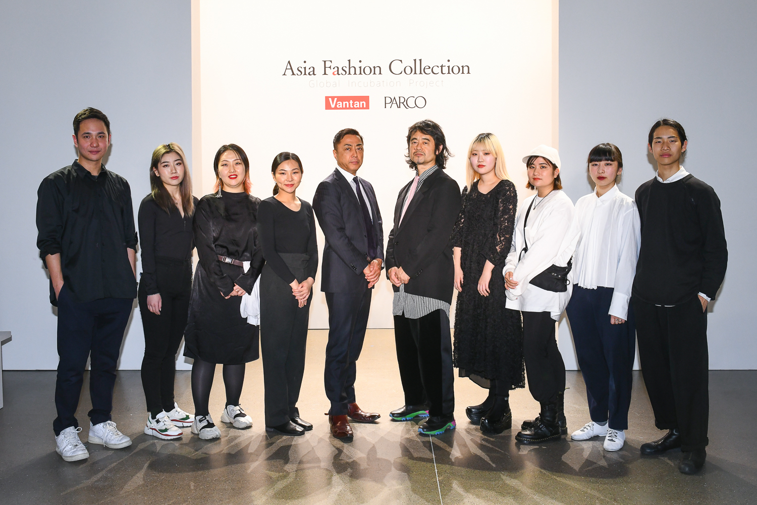 <左より>シォン ノン・リィアオ、シユアン ジン(『zizi shi』デザイナーチーム)、ヤン ユナ、チャリサ・アネクウォラクン、株式会社バンタン 代表取締役会長 石川 広己、株式会社パルコ 執行役 溝口 岳、宮下 奈々、片岡 シキ・カーラ、伊藤 来未、竹中 太将