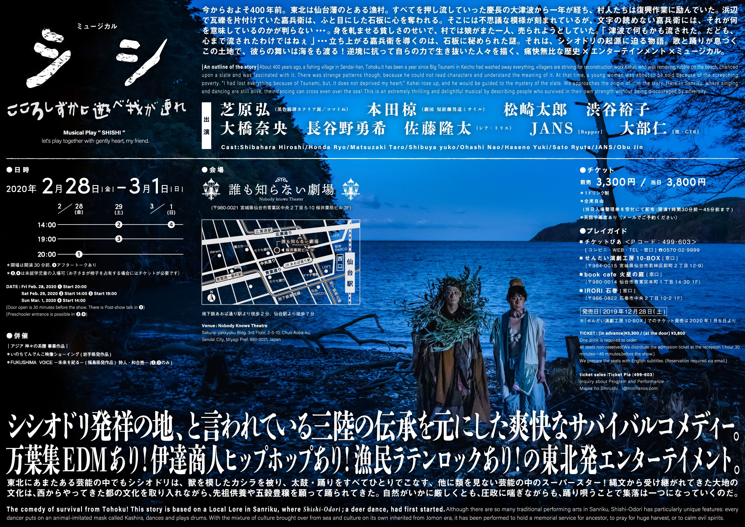 東日本大震災の被災地、宮城県南三陸町に伝わる鹿子踊を題材にしたミュージカル ” シシ こころしずかに遊べ我が連れ” 2月28日~3月1日、仙台市青葉区中央の「誰も知らない劇場」にて公演する。