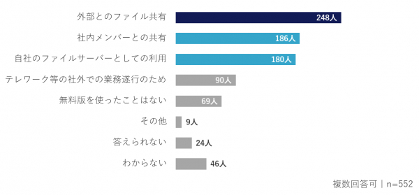(33.7%)、「自社のファイルサーバーとしての利用」は180人(32.6%)といずれも30%以上の回答者が選択している。その他では「個人的な利用」「ファイル倉庫」「データのバックアップ」「データ保存先」の回答があった。