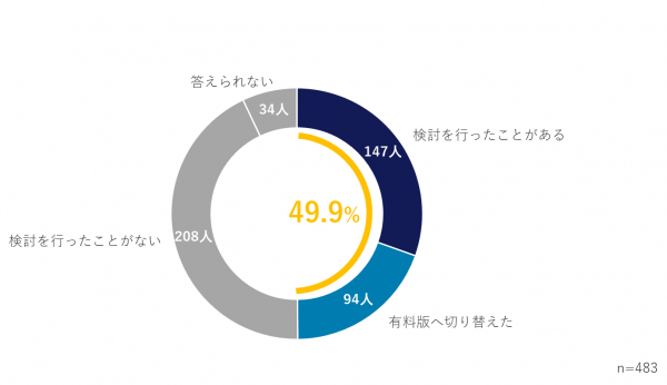 ⇒無料版を使ったことがある人のうち「検討を行ったことがある」「有料版へ切り替えた」が241人(49.9%)と約半数を占める。