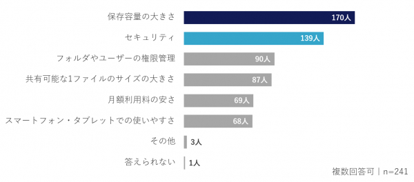 ⇒「有償版を検討した」「切り替えた」際の重視点のトップは「保存容量の大きさ」で170人(70.5%)と高い。「セキュリティ」も139人(57.7%)と高くなっている。
