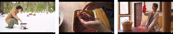 この『愛里沙の北海道暮らし』では、その北海道を舞台に撮影しています。しんしんと降る雪の中、畑に出ていき雪の下で保存していた野菜を掘り起こすシーンからスタートします。このような厳しくも美しい自然環境の中で、原野の素材にこだわって調理した食事を家族と食べることや、昔ながらの生活の知恵を暮らしに活かすような動画を展開していきます。便利で忙しい現代から立ち止まり、昔ながらの伝統文化を体験、継承することを通じて、手間と時間と心を込めた人の「暮らし」を作品として制作します。