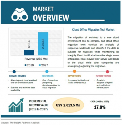 The Insight Partnersによると、世界のクラウドオフィス移行ツール市場は、2018年に6億5,040万米ドル規模に達し、2027年には27億5,380万米ドルに到達すると予想されています。予測期間中、同市場はCAGR17.8%で成長する見込みです。