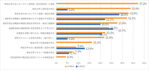 具体的な対策は、「来社を伴わないオンライン説明会(web説明会)」「オンライン面接・面談」が最も多い結果となりました。とくに新規に加えた「オンライン説明会(web説明会)」が37.2%と急増しており、採用活動のweb化が急速に進んでいることが分かります。一方で「選考スケジュール全体の見直し(後ろ倒し)」「来社を伴う説明会の中止」「来社を伴う対面面接の中止」といった項目も大きく伸びており、オンラインでの実施ではなく、「一旦中止にしてスケジュールを後ろ倒し」という会社も一定数出ていることが想像できます。
