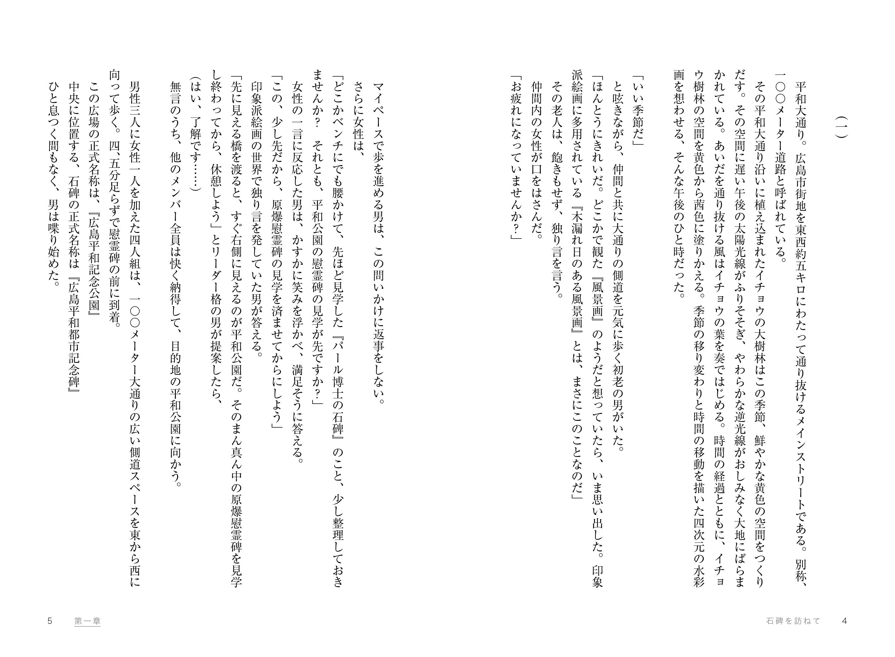 物語は広島平和都市記念碑の「安らかに眠ってください……過ちは繰返しませぬから」の一文から始まる。