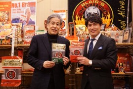 大畑さんには、『テング ビーフステーキジャーキー』4種のフレーバー、定番の「レギュラー」タイプ、ピリッと胡椒の効いた「ホット」タイプ、激辛ソースとして知られている人気の“ブレアーズ サドンデスジョロキア”を使った「激辛」タイプ、そして「レギュラー」タイプの塩分が半分になった「50%減塩」を食べ比べていただきました。現役時代は、オーストラリアやニュージーランドに行く機会が多く、現地のビーフジャーキーをよく食べていたと言う大畑さん。その頃の懐かしい味と比べるかのように、『テング ビーフステーキジャーキー』をたくさん召し上がっていただきました。
