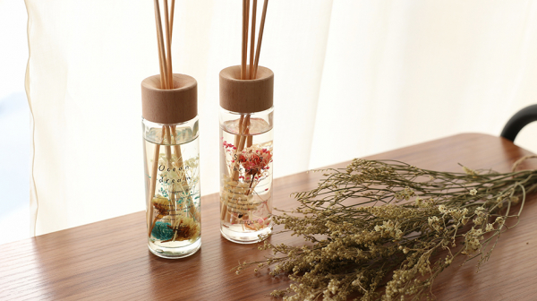 小さなリードディフューザーは、お部屋の隅や玄関などにもぴったりのサイズ感。