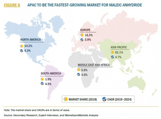 APACの無水マレイン酸市場は、2019年から2024年の間に価値の点で最高のCAGRを記録する予定です。2018年の世界の無水マレイン酸市場の62.1%のシェアを占めています。APACの市場の成長は主に成長している建築および建設および自動車産業によって推進されています。 APACの最終用途産業の成長、急速な工業化、原料の入手可能性、および人々の生活水準の向上が、無水マレイン酸市場を牽引しています。北米の無水マレイン酸市場は、成熟した最終用途産業とベンゼンベースの無水マレイン酸の使用を制限する厳しい政府規制により、予測期間中に緩やかな成長を目撃すると予想されます。ヨーロッパと北米の市場は成熟期に向かっています。したがって、彼らはAPACよりも遅い成長率を目撃することが期待されています。中東およびアフリカの市場は、急速に成長している建築および建設および自動車産業により、2019年から2024年の間に価値で2番目に高いCAGRを登録する予定です。活況を呈している自動車産業は、国際的な自動車メーカーを惹きつけて、この地域に製造および流通センターを設立し、無水マレイン酸の需要を増やす可能性があります。また、中東およびアフリカは、無水マレイン酸製造会社に有利な機会を提供します。これは、世界的に新興市場の1つであるためです。無水マレイン酸市場は細分化されているため、競争が激しく、Huntsman International LLC(米国)、Changzhou Yabang Chemical Co.、Ltd.(中国)、Shanxi Qiaoyou Chemical Co.、Ltd.(中国)、Polynt-Reichhold Group(イタリア)、Zibo Qixiang Tengda Chemical Co.、Ltd. )、およびGulf Advanced Chemical Industries Co.、Ltd.(GACIC)(サウジアラビア)が市場の大きなシェアを占めています。地元の小さなプレーヤーはかなりの市場シェアを持っています。主要市場のプレーヤーは、市場シェアを獲得し、グローバル市場での地位を強化するための主要な成長戦略として、事業拡大および提携を採用しています。