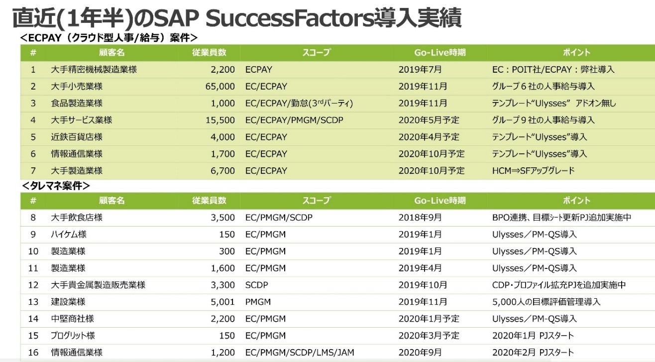 この受賞により、人事給与システム(EC/ECPAY)は勿論、タレントマネジメントシステムも含め、SAP SuccessFactorsをベースにした弊社導入テンプレート「Ulysses」を活用した『Fit to Standard』アプローチよる短期間・低コスト導入の実績を重ね、本分野での先駆的ポジションを確立して参ります。