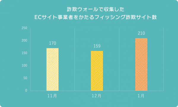 2020年1月度はECサイト事業者をかたるフィッシング詐欺サイトが増加しました。詐欺ウォールで収集したECサイト事業者をかたるフィッシング詐欺サイト数は、11月に170件だったものが、12月には159件まで減少し、1月は210件と前月の1.32倍まで増加しました。