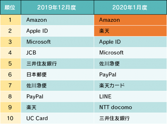 なお、詐欺ウォールで収集したフィッシング詐欺サイトにて盗用されたブランドの上位10件は以下のようになっています。1月度は上位2位にECサイト事業者がランクインしています。