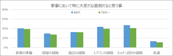 今回、60代以上のシニアが7割を占める当社の会員向けに、日ごろの家事や起こると困る生活上のトラブルを2020年2月28日~3月2日の間で調査したところ(n=3,989)、特に家事においては「キッチン周りの掃除」や「エアコンの掃除」など、日ごろ手の届かない部分の掃除に負担を感じるシニアが4~5割いることが分かりました。また、今後起こりそうな生活上のトラブルについては「水のトラブル」が60代で57%、70代でも51%と水回りのトラブルに不安を抱えているシニアが多いことが判明しました。