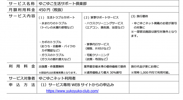 本サービスでは水回りや鍵などの生活トラブル、家事代行などの家事サポートサービスの2つのサービスを月額ワンコインで提供します。利用者はゆこゆこネット経由の旅行予約が常に1,000円引になるなどの特典を受けることが可能で、より豊かで安心した生活を送っていただけるよう、本サービスを通じて当社とJBRはシニアの生活をさらにサポートしてまいります。
