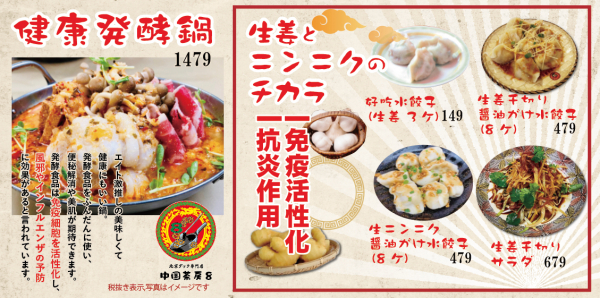 今回登場した料理は、さまざまな発酵食品をふんだんに入れた「健康発酵鍋1479円」、「好吃水餃子(生姜)3ケ149円」、「生姜千切り醤油がけ水餃子8ケ479円」、「生ニンニク醤油がけ水餃子(8ケ)479円」、「生姜千切りサラダ679円」の5品(全て税抜)。