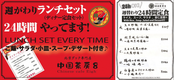 2020年3月5日、24時間定食をスタートしました。中国茶房8で人気の週替わりのランチセット(各店500円代~)を朝から深夜まで24時間いつでもご注文可能になりました。時差出勤などで食事を摂る時間が乱れがちな方も、ぜひご来店ください!