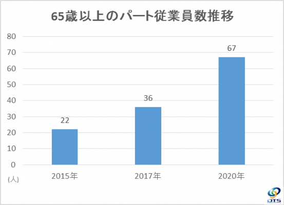 当社では創業当時から「主婦の経験とノウハウが、アパレル製品の取り扱いや丁寧でミスのない梱包作業などに生かされ、従業員に対する後進育成において力を発揮してくれるだろう」という創業者の考えから、女性パート従業員の積極雇用を行ってきました。65歳以上のシニア女性パート従業員の割合は5年前の約3倍に増加し、2020年3月現在で全女性パート従業員の1割を超えました。最高齢の従業員は75歳です。