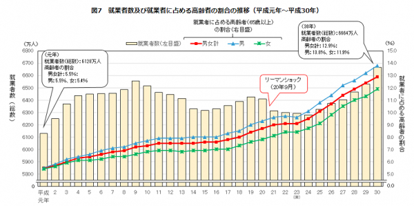 内閣府男女共同参画局による平成30年度版・男女共同参画白書によると、「就業者」に占める65歳以上人口の割合は上昇傾向にあり、平成25年(10.1%)に初めて1割を超え、元年(5.5%)から30年(12.9%)で7.4ポイント上昇しています。(https://www.stat.go.jp/data/topics/topi1192.html)