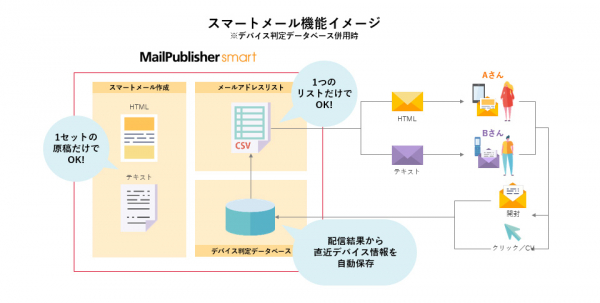 今回リリースした「スマートメール」は、1セットの原稿・1つのメールアドレスリストを用意し、1回の配信設定を行うだけで、受信環境に応じて自動的にHTMLメールとテキストメールを送り分ける機能です。オプションのデバイス判定データベース機能※1※2 を併用することで、過去のメール配信結果から取得したデバイス(受信環境)の情報をもとに、送り分けの精度を高めることもできます。