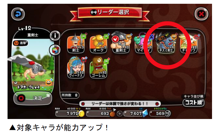 リーグで行われるすべてのバトルを対象に、特定のキャラをリーダーにすると能力値(攻撃・防御・HP)やスキル発動率がアップします。