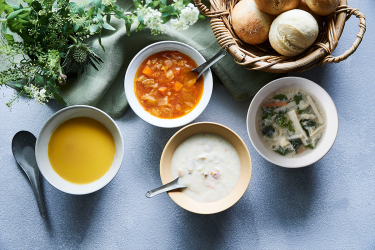 ■セット内容:野菜を食べるミネストローネ(180g×1袋)、筍と菜の花のふわふわ卵スープ(180g×1袋)、具だくさんクリームチャウダー(味わいベーコン)(230g×1袋)、濃厚かぼちゃのポタージュ(180g×1袋)