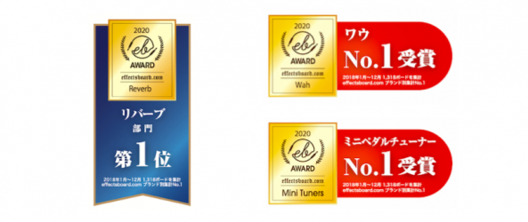 「エフェボーAWARD」は、ユーザーが投稿したエフェクターボードの写真を基に部門毎に選別して集計しています。したがって一般的なランキングでよくある「人気投票」ではなく、楽器店で購入され、実際にライブやスタジオ等の現場で使われているエフェクターブランドおよび売れ筋製品がわかるのがエフェボーAWARDの特徴です。