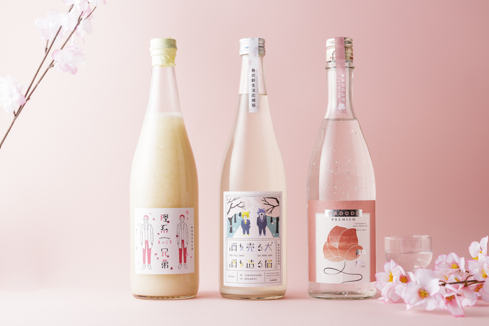 ▲【写真】企画限定ラベル酒。左から、理系兄弟プレミアムまっこり/酒を売る犬 酒を造る猫 春の新生活応援版/門出プレミアム。(※すべて日本酒、非売品)