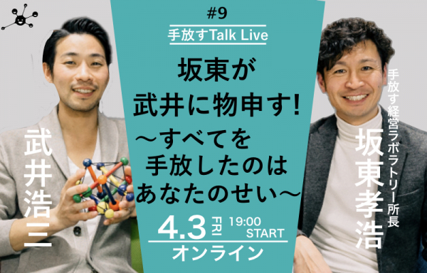 手放す経営ラボラトリー(運営会社株式会社ブレスカンパニー)の所長の坂東孝浩が、ダイヤモンドメディア元社長の武井浩三に全てを手放してしまったその想いの丈をぶつけます!