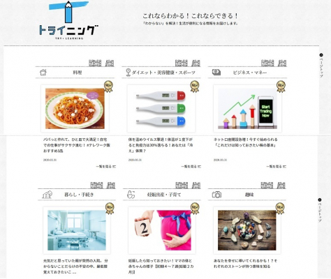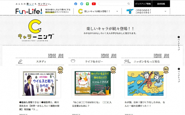 本サイトでは、カテゴリーを「キャラーニング」「トライニング」「ピックアップ情報」の3コーナーに大別し、お役立ち記事を掲載。さまざまな生活シーンにおいて、読者に寄り添うことのできるコンテンツづくりを目指す。