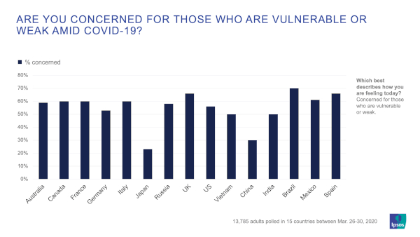 4月2日ーイプソスが世界15カ国で実施した世論調査で、対象者の過半数が、ロックダウンや閉鎖で何百万人もが自己隔離をしているような状態にもかかわらず、コロナウイルスによるパンデミックに対して弱い立場の人々のことを最も気にかけていることがわかりました。