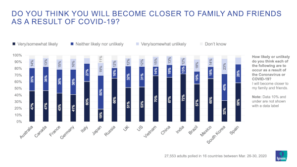 イプソス パブリックアフェアーズ部門のグローバルリーダーであるダレル・ブリッカーは、今回の調査結果は、社会的距離をとるという施策で私たちは孤立しているかもしれないが、一方でこの危機が私たちをより親密にする兆候があると述べました。