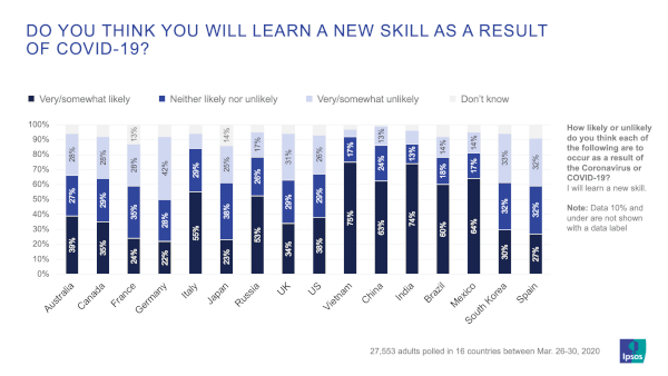 私たちの多くは、この危機の中で新たな孤独な時間を有効に活用しようとしています。調査対象者の44%が、ウイルスの感染拡大の結果、新しいスキルを習得する可能性が高いと楽観しています。ベトナム(75%)、インド(74%) 、メキシコ(64%)、中国(63%)、ブラジル(60%)などの新興市場ではこの傾向は高く、ドイツ(42%)、韓国(33%)、スペイン(32%)、英国(31%)などでは低くなっています。