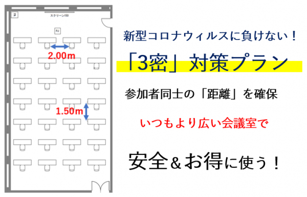参加者の席幅をいつもより広くとって、安全にご実施いただけるように対策いたします