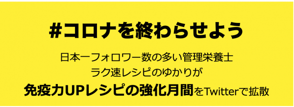 緊急事態宣言で普段あまり自炊をしない方からは「スーパーで何を買っていいかわからない」の声が上がっています。そこで同社は日本一フォロワー数が多い、フォロワー数28.9万人の人気アカウント、管理栄養士の「ラク速レシピゆかり」が免疫力UPレシピの発信強化月間を実施します。料理をしない方も簡単に作れて美味しいレシピを皆で拡散させることで、一人一人の拡散力で必要な情報を必要な人に行き渡らせることができます。