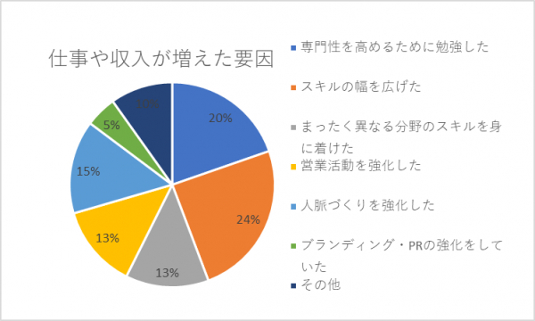 仕事量や収入が増えた方に、その要因を聞いたところ、「スキルの幅を広げられるような経験を積んでいたこと」という回答が24%と一番多くなり、次いで「専門性を高めるために勉強していた」との回答が20%となりました。フリーランスがこれからの仕事につなげていくためには、専門性を高めるだけでなく、“スキルの幅を広げる”という視点から、取り組む案件やキャリア形成を考えることが有効であることが分かります。