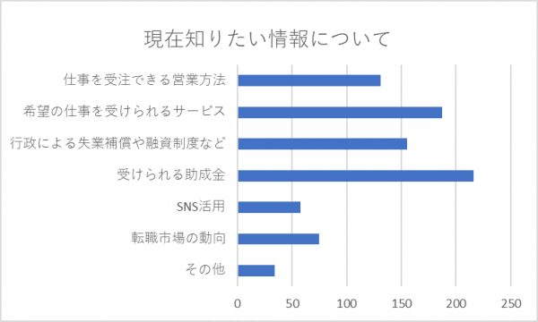 また、今知りたい情報について尋ねたところ、「フリーランス・法人で受けることが可能な助成金について」が全体の63.5%と最も多く、次いで「希望の仕事を受けられる案件紹介サービスについて」が55%、「行政による失業補償や融資制度、手続き方法について」が45%という結果となりました。現在の不安定な経済状況の中で、多くのフリーランスが自身のリスクに対応するための情報を求めていることが分かります。