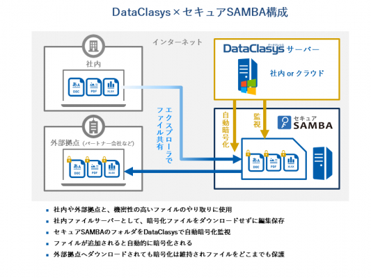 スターティアホールディングス株式会社(本社:東京都新宿区、代表:本郷秀之、コード:3393)は、クラウドストレージサービス「セキュアSAMBA」を提供する、子会社スターティアレイズ株式会社(本社:東京都新宿区、代表:古川征且)が、ファイル暗号化サービスを提供する株式会社DataClasys(本社:東京都千代田区、代表:曽我祐二郎、以下DataClasys社)と製品の販売に関する契約を締結し、業務提携したことを本日発表いたします。個人情報保護法の制度改正大綱ではデータ暗号化やデータ利便性についての記載が増え、市場でのニーズが高まっていることを受け、暗号化・DRMで高い実績を持つDataClasys社との提携に至りました。