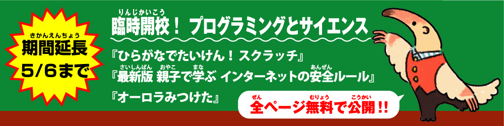 また、すでに無料公開している、子ども向けプログラミング書籍『ひらがなでたいけん! スクラッチ はじめてのプログラミング』と、親子でネットルールを考える『最新版 親子で学ぶインターネットの安全ルール 小学生・中学生編』の2冊についても、公開期間を当初の4月5日(日)から、2020年5月6日(日)まで延長することにしました。