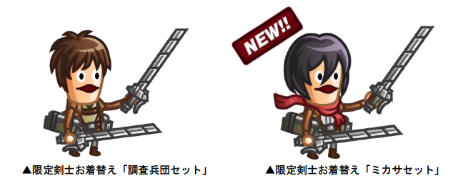 2020年4月10日(金)メンテナンス後より、TVアニメ『進撃の巨人』との復刻コラボイベントを開催いたします。コラボ期間中でしか手に入らない限定キャラ「調査兵団」がEGGショップに再登場!「調査兵団」はエレンやミカサ、リヴァイなどの『進撃の巨人』に登場するキャラクターにお着替えが可能です。また今回新たに、ミカサの剣士限定お着替えも登場!期間限定の夢のコラボをどうぞお楽しみください!