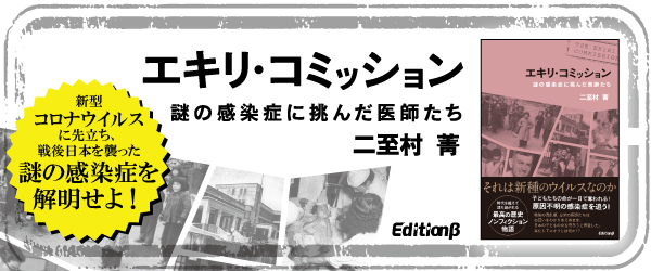 エディションベータ株式会社(本社:東京都江戸川区)は2020年4月25日に自社初刊行の書籍『エキリ・コミッション 謎の感染症に挑んだ医師たち』(著:二至村菁)を発売します。現在、新型コロナウイルスの感染拡大が続いていますが、本書はかつて日本の子どもたちを襲った謎の感染症「エキリ」をめぐる人々の奮闘を描いたノンフィクションです。