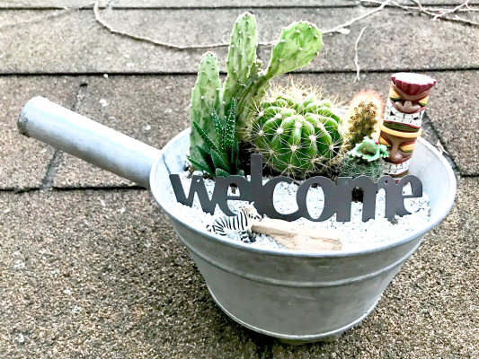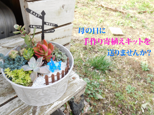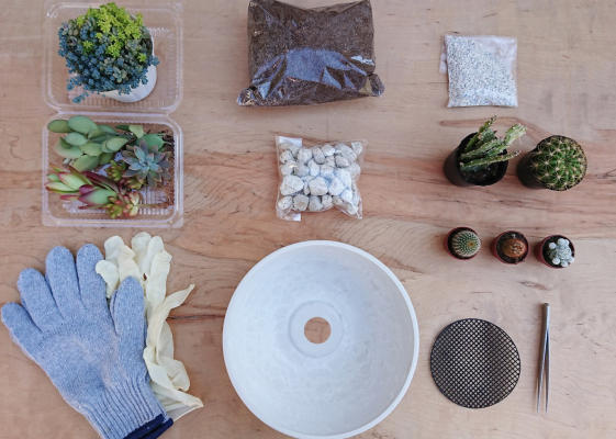 寄植えだけでも充分に可愛い多肉植物とサボテンですが、今回はオマケのフィギュアが付いています。自由な発想で自分だけのアレンジが楽しめます。