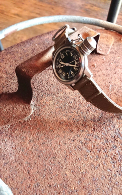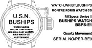 T(UNDERWATER DEMOLITION TEAM)水中爆破チームが使用した腕時計です。リューズ部分にパッキ ンが入った大型のキャップを付けることで、防水性能をあげました。UDTの任務は強襲上陸作戦に先立って海中や海岸から機雷や 障害物を取り除く事であった為、隊員の時計には水中での作業にも耐えうる防水機能が必要でした。この大きなリュウズキャップ 形状からキャンティーンcantee(水筒)と呼ばれていました。 文字盤と裏蓋に刻印された「BUSHIPs」とはBureau of Shipsの略で艦艇局を意味しています。