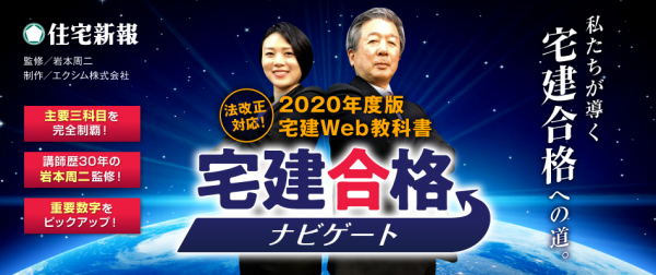 宅建受験界のパイオニア・(株)住宅新報をアドバイザーに迎え、ベテラン宅建講師・岩本周二が監修し、不動産広告代理店・エクシム(株)が企画制作した、音声ガイド付き宅建Web教科書「2020年度版 宅建合格ナビゲート」。主要3科目を網羅し、価格は4,400円(税込)。画面はテキストベースで進み、女性ナビゲーターがポイントを伝えていきます。自宅学習や独学はもちろん、初学者の基礎固めや上級者の復習などに適したコンテンツです。