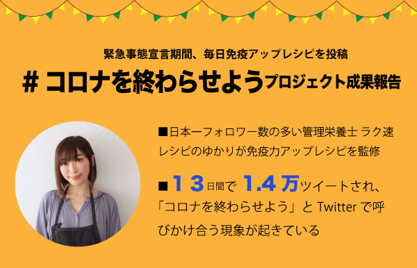 4月7日より同社は自社で運営するTwitterアカウント、管理栄養士ラク速レシピのゆかり、しかない料理のイガゴー、ゆりか画伯@お絵かきCookingなど合計41万フォロワーの発信力を活用して、ハッシュタグ「#コロナを終わらせよう」のついた免疫力アップレシピを拡散を始めました。