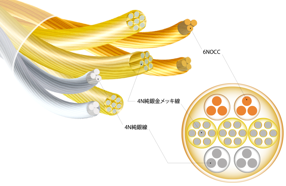 線材の材質・太さ・本数を独自に組み合わせ開発された3種混合の新導体を採用。4N純銀・金メッキを中心に、4N純銀、6N OCCの3種を一つの芯線にすることで、優れた解像度と奥行、高さといった立体的な音場空間を実現。明瞭で広がりのある中高域とタイトに締まった低域、自然で広がりのある豊かな音を生み出しています。また、1芯あたり33本、4芯構成にすることで、奥行きのある豊かな響きと、透き通った高域を保ちながら、レスポンスの速い躍動感のある低域.を引き出し、すべての帯域にわたって、透明感に優れた張りのある伸びやかなサウンドを実現します。