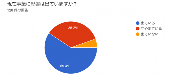 「コロナウイルスによって現在事業に影響は出ていますか?」という質問に対し、「出ている」と回答した事業者が約6割(59.4%)にも上り、「やや出ている」とした事業者も35.2%と、合わせて94.6%の事業者は影響を受けていることがわかりました。