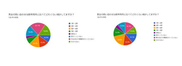 「買主からの問い合わせ状況」は、事業を行っていない18社を除いた110社の内、7割を超える82社が「減っている」と回答。全体としては売主以上に買主の動きが鈍っている様子が読み取れる結果となりました。