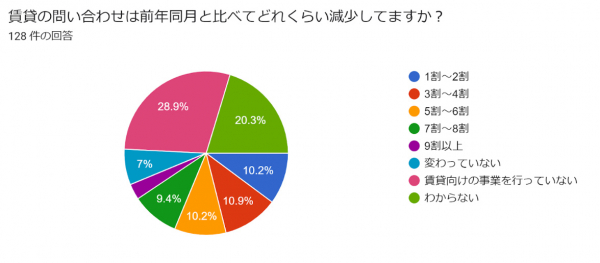 売買市場に対して賃貸市場を見ていくと、賃貸事業を行っていない37社を除いた91社の内、6割強となる56社が「問い合わせが減っている」と回答。「わからない」という回答数が、売買市場と比較し多いため実態の把握が難しくはあるものの、「変わっていない」との回答が唯一、1割以下の7%に留まっていることから、コロナウイルスの影響を最も強く受けている市場である可能性が考えられます。