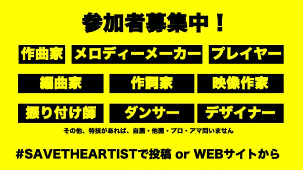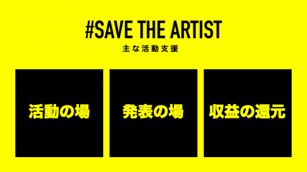 「#SAVE THE ARTIST」では、新型コロナウイルスの影響を受け、活動ができないミュージシャンなどの新たな活動の場、収益源の創出として、SNSやリモートワークを活用し、幅広いクリエイターやアーティストとコラボし、活動で得た収益を分配する取り組みを行ってまいります。