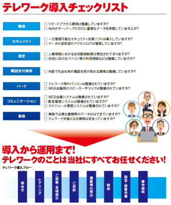 併せて、企業様毎に最適なテレワーク導入プランをご提案させていただくサービスも開始いたしました。機器選定から導入後の運用方法まで、当社グループ企業との総合力にて柔軟に対応いたします。ご要望に応じ、必要な機器だけの提供も可能です。
